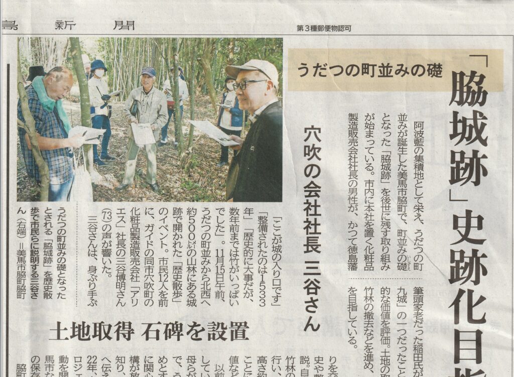 徳島新聞(2025年12月3日)に「たち風プロジェクト」の脇城跡保存の取り組みが、以下のように紹介されました。